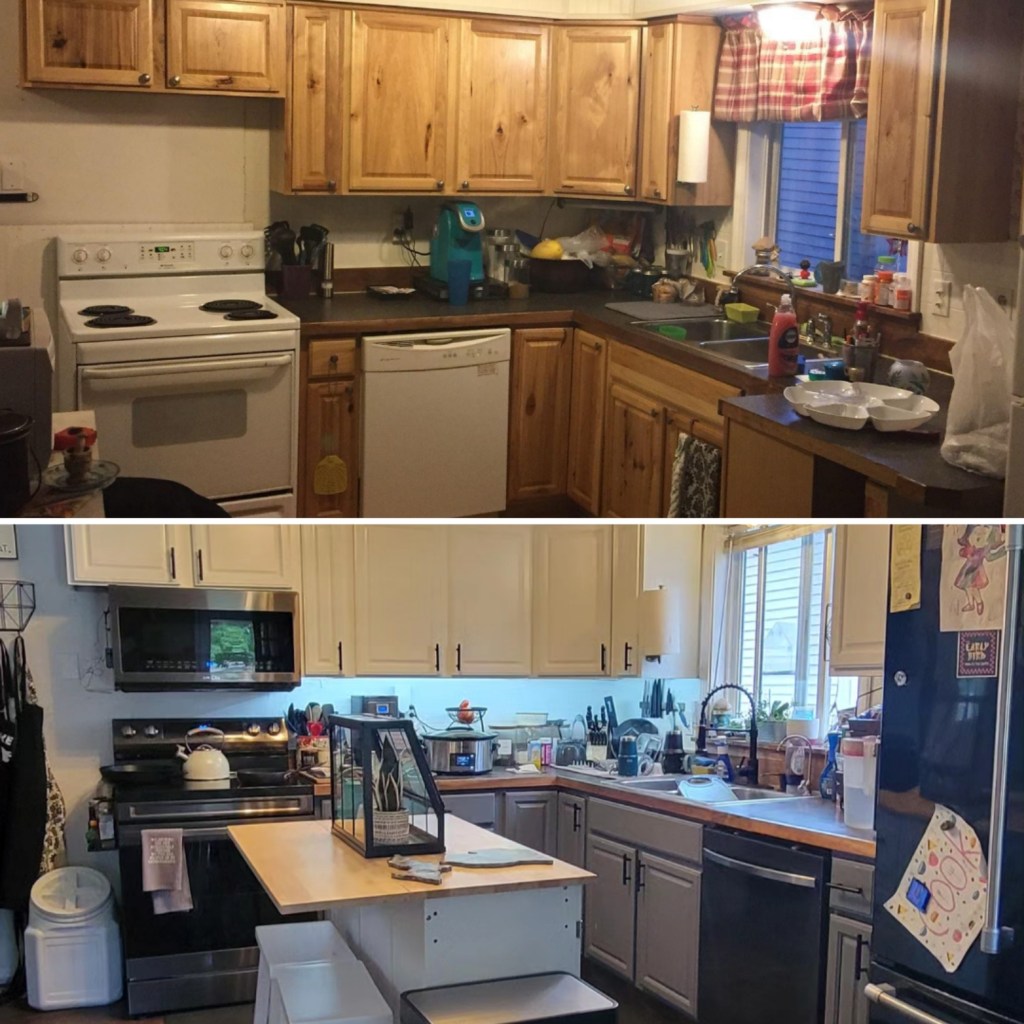 I have middle of the road pots and pans (I currently have a Carote detachable handle set, and they are nicely nonstick), and a Samsung black stainless appliance suite that I love, excluding the range, because it was too difficult to change over to gas. The glass cooktop is impossible not to scratch, especially for my husband and teenage son. We took some of our money this year and invested it into painting the cabinets and replacing the hardware (including upgrading to quiet-close hinges, which has been wonderful to have) and adding under-cabinet LED lighting. I have included a before and after below. My counters are still granite-look formica, but I am looking to change that, at some point this year. My mom lives with us, and she is helping us out with that, but I need to stop being indecisive (once they are changed, they will stay that way, so I am torn between materials and patterns).